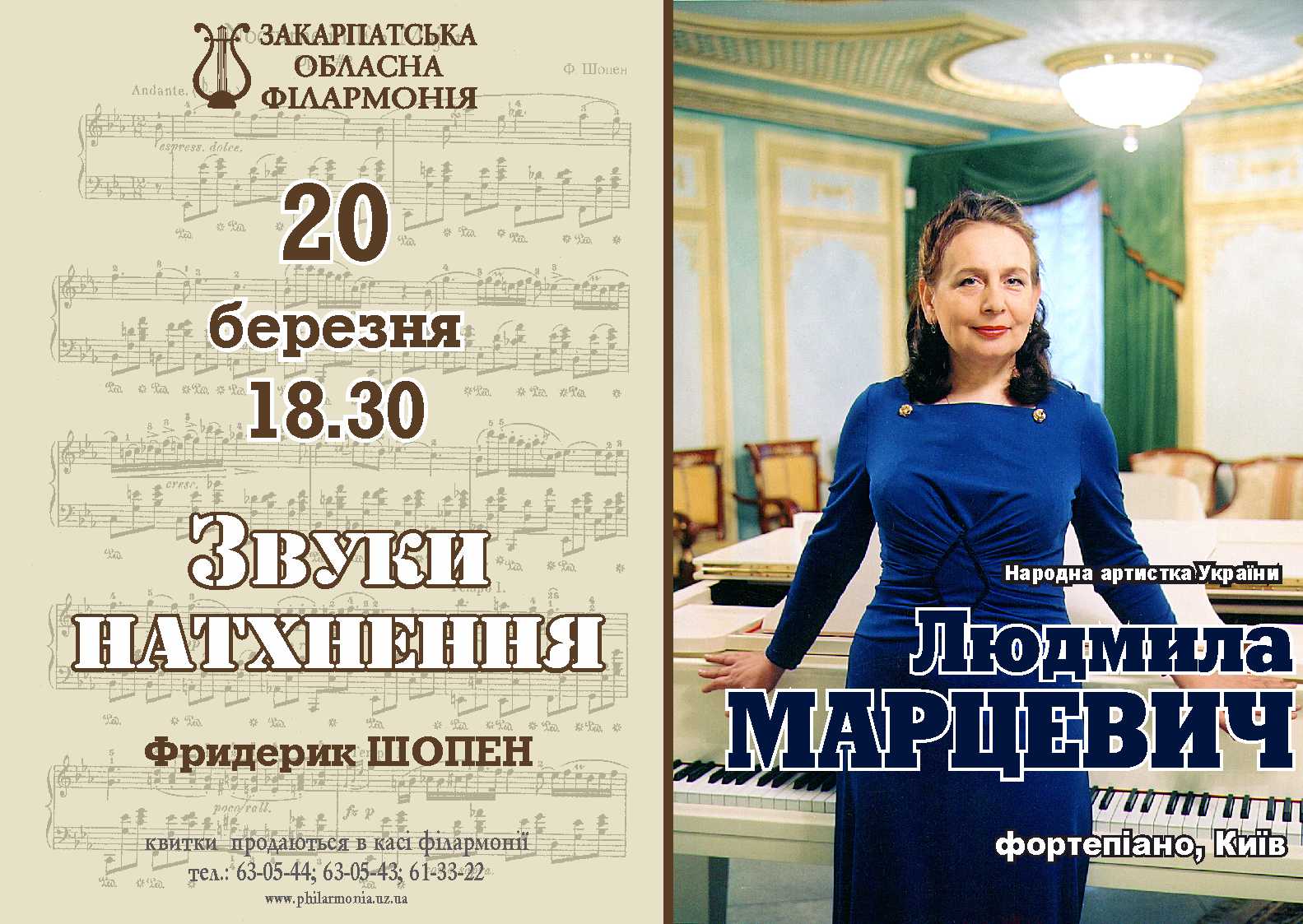 Сьогодні, 20 березня, у Закарпатській обласній філармонії народна артистка України Людмила Марцевич даруватиме слухачам «Звуки натхнення» – програму із фортепіанних творів Фридерика Шопена. У концерті прозвучать відомі ноктюрни, полонези, прелюдії, мазурки, балади та скерцо геніального польського композитора.