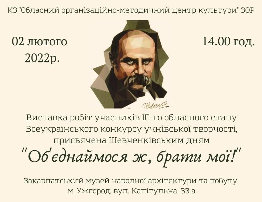 Завтра, 2 лютого, відбудеться відкриття виставки робіт учасників ІІІ обласного етапу Всеукраїнського конкурсу учнівської творчості, присвяченої Шевченківським дням під гаслом «Об’єднаймося ж, брати мої!».