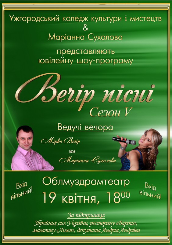 19 квітня в залі Закарпатського обласного українського музично-драматичного театру ім.братів Шерегіїв відбудеться ювілейний, п'ятий за ліком "Вечір пісні" за участі молодих артистів Ужгородського коледжу культури і мистецтв.