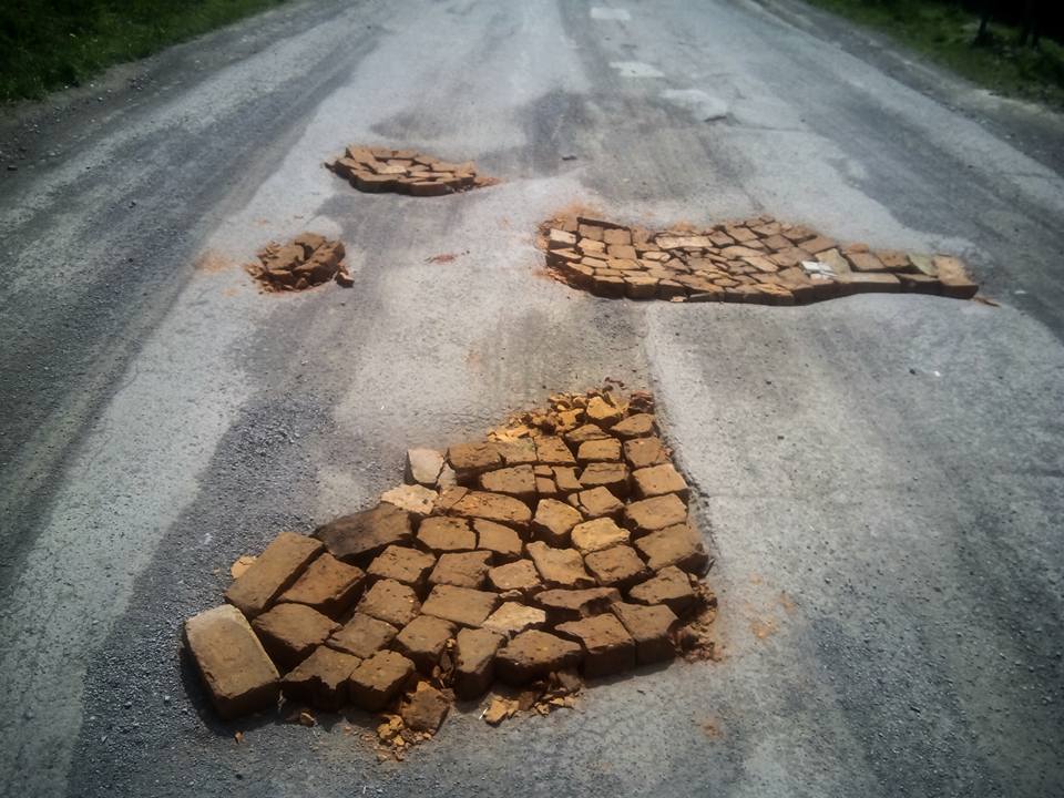 На ній зображено участок дороги поблизу коньячного заводу в Ужгороді. Імовірно, ями цеглинами із відчаю заклали самі водії.