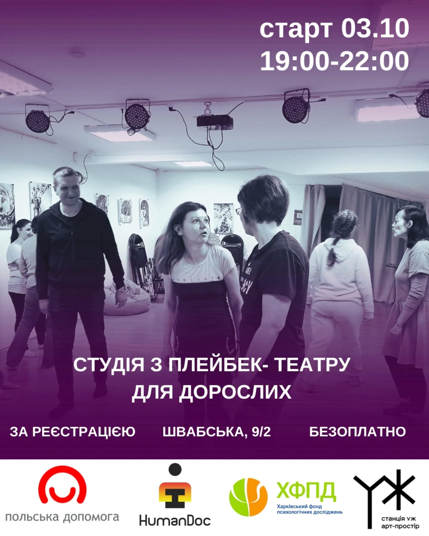У пʼятницю, 3 жовтня, в Ужгороді стартують ознайомчі заняття для охочих долучитися до плейбек-театру, де кожен зможе спробувати себе у ролі актора. Розпочнеться студія у арт-просторі «Станція Уж» о 19:00.