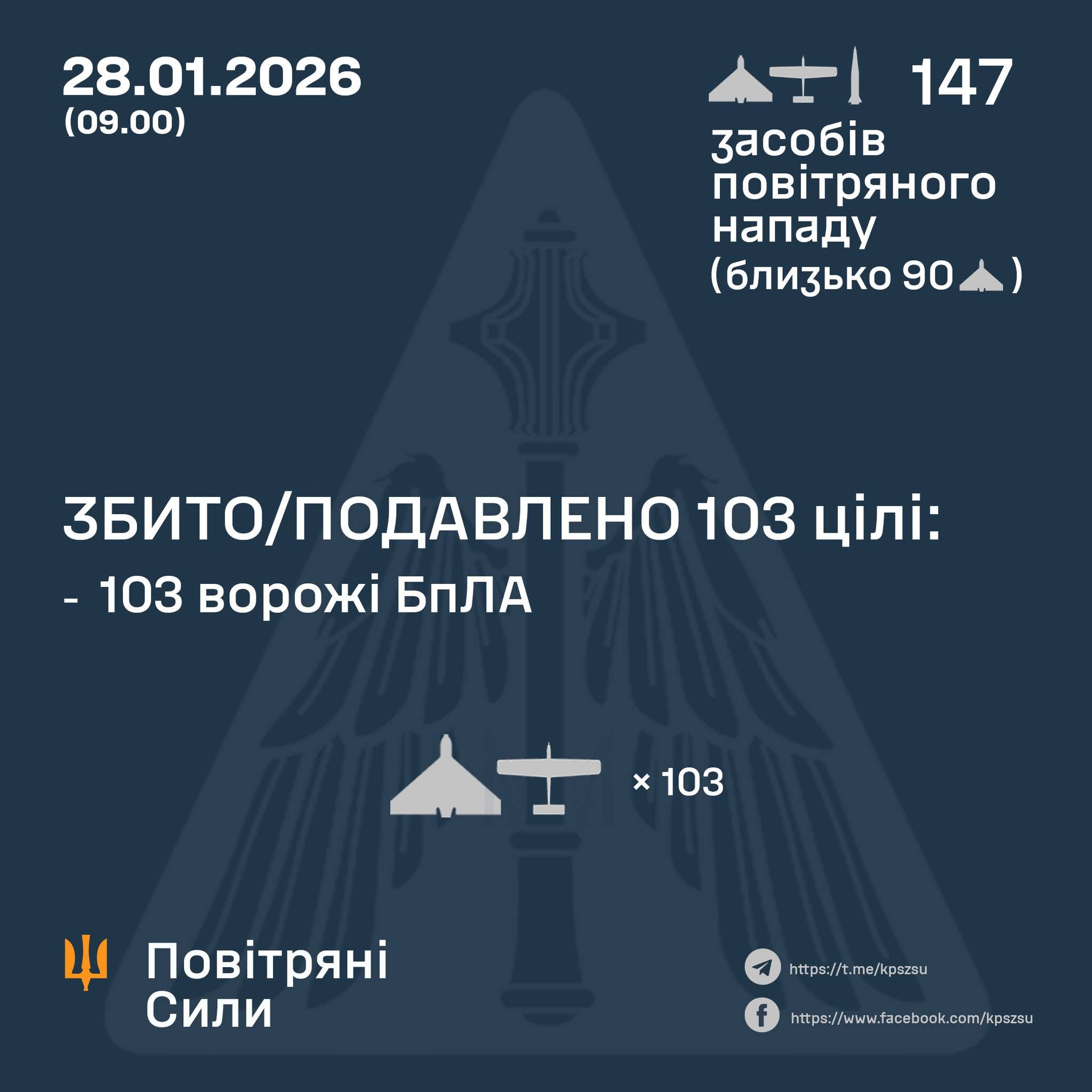 За попередніми даними, станом на 09:00, протиповітряною обороною збито/подавлено 103 ворожі БпЛА типу Shahed, Гербера і дрони інших типів на півночі, півдні, центрі та сході країни.