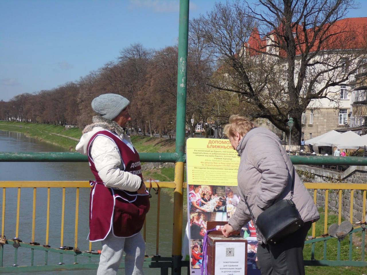 Олена Горняк, яку точно знають усі ужгородці, вже близько десяти років допомагає збирати кошти на харчування для тих, хто перебуває у непростому матеріальному становищі. Частіше всього люди зустрічають її якраз-таки на пішохідному мості: ужгородці, які часто бувають у центрі, знають її вислови із закликом допомогти напам’ять. За будь-яку пожертву жінка дарує перехожим цукерки із фразами, які можуть викликати усмішку, зігріти теплом чи покращити настрій.