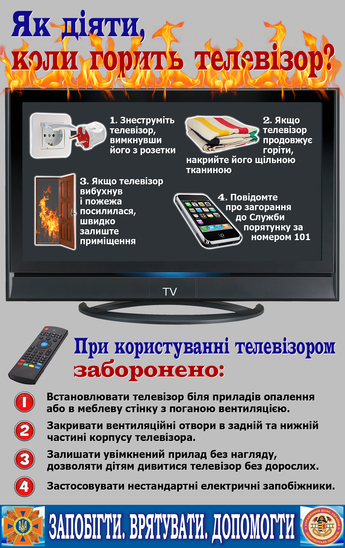 Якщо вчасно не загасити палаючий телевізор, вогонь із нього може перекинутися на меблі й призвести до значних матеріальних збитків для господарів. Аби люди були готові до подібних «сюрпризів» від техніки, Управління ДСНС України у Закарпатській області нагадує громадянам порядок дій при загоранні телевізора.