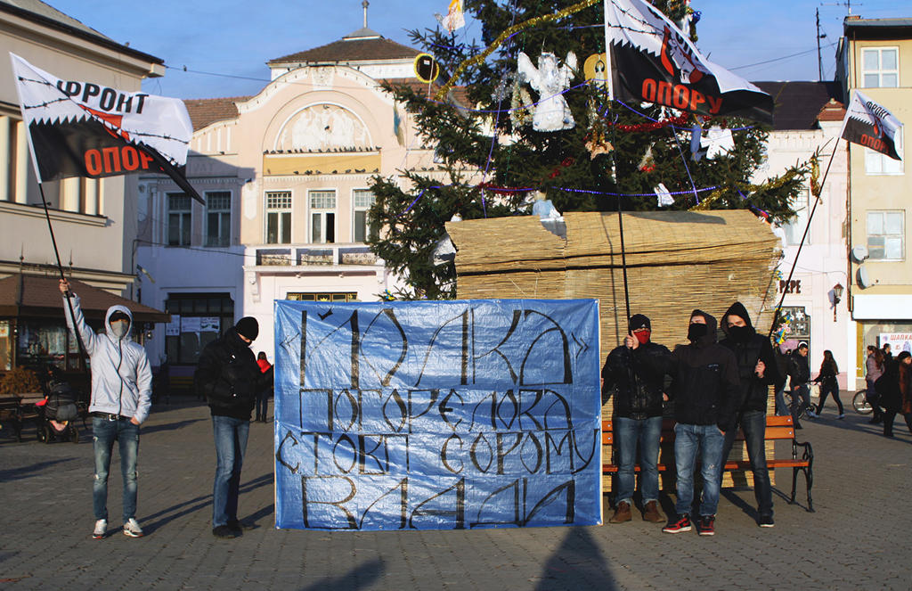 Нагадуємо, що ФРОНТ ОПОРУ вважає ялинку на Театральній площі Ужгорода зайвою, адже поруч, на площі Петефі, раніше була встановлена міська ялинка. Ялинка ж на Театральній була встановлена владою міста навмисно, щоб унеможливити проведення на цій площі акцій Євромайдану.