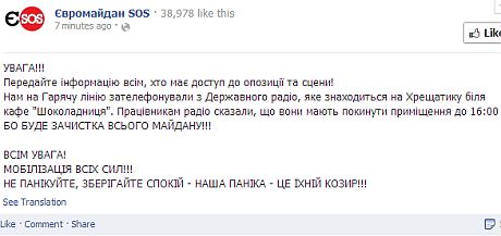 "Нам на Гарячу лінію зателефонували з Державного радіо, яке знаходиться на Хрещатику біля кафе "Шоколадниця". Працівникам радіо сказали, що вони мають покинути приміщення до 16:00 - бо буде зачистка всього Майдану!", - сказано у повідомленні на Facebook.