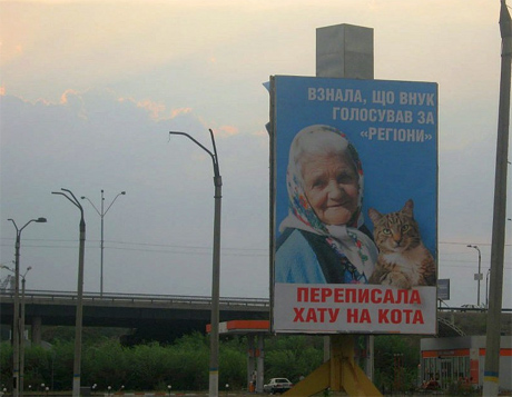 Як раніше повідомлялося, губернатор Дніпропетровської області Олександр Вілкул вимагав зняти білборди, які агітують проти діючої влади, - у тому числі й рекламний плакат з пенсіонеркою й котом.