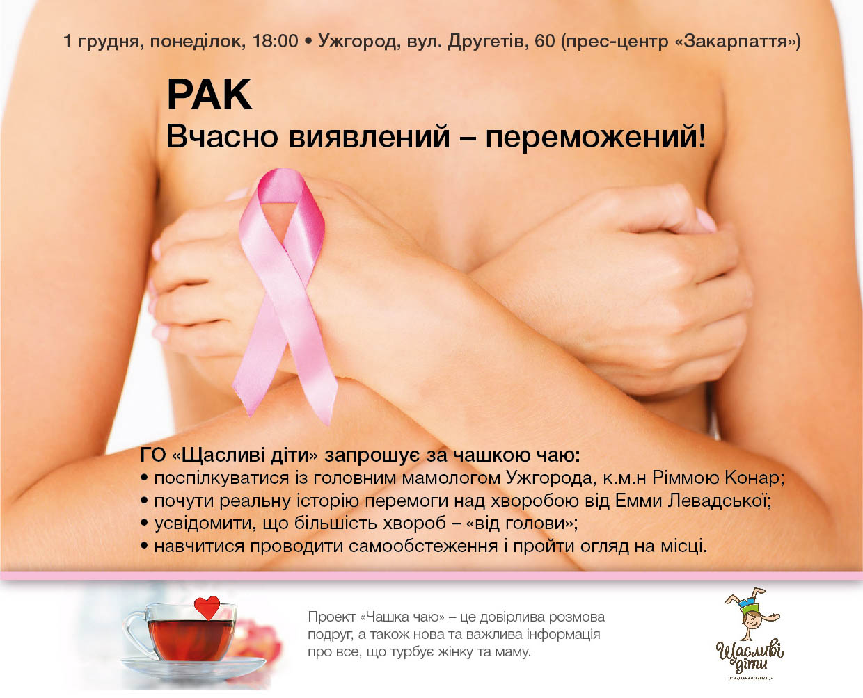 "Уявіть собі, що кожна 6-та жінка планети помирає від раку грудей... Уявіть, що у 90% випадків хворобу можна легко подолати, виявивши її на ранній стадії! Але як важко знайти для себе час: діти, робота, домашні клопоти... Та й довжелезні черги у поліклініці аж ніяк не приваблюють. Піклування про себе - "на потім". Знайомо?