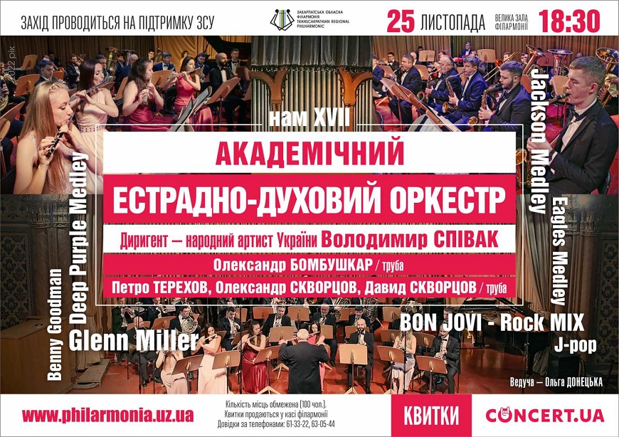 25 листопада 2022 (п’ятниця) велика зала Закарпатської обласної філармонії запрошує на музичний вечір академічного естрадно-духового оркестру. У концерті візьмуть участь солісти-інструменталісти: Олександр Бомбушкар (труба), Петро Терехов (труба), Олександр Скворцов (труба) та Давид Скворцов (труба).