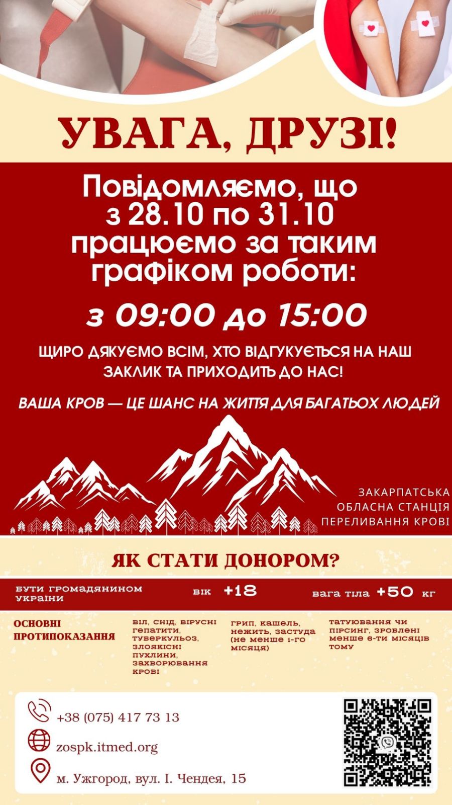Для зручності донорів та у зв’язку з критичною нестачею компонентів крові Закарпатська обласна станція переливання крові 28-31 жовтня розширює графік роботи до 15:00.