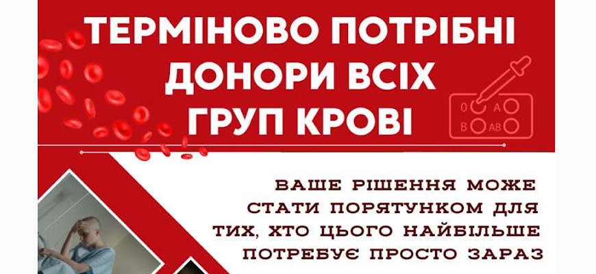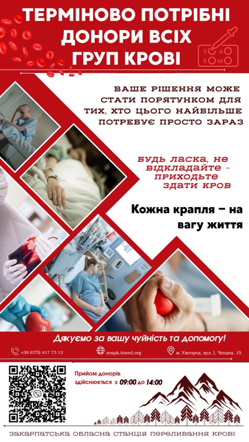Закарпатська обласна станція переливання крові повідомляє про термінову потребу в донорах.