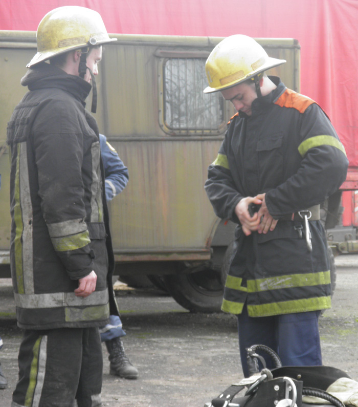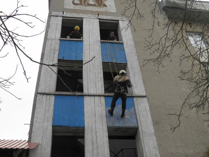 Після теоретичної частини рятувальники на практиці відпрацьовували способи рятування людей з висоти за допомогою рятувальної мотузки, саморятування та евакуації постраждалих з непридатного для дихання середовища.