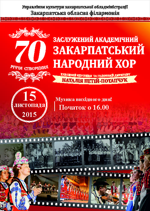 Святковий вечір з нагоди 70-ліття Заслуженого академічного Закарпатського народного хору, який відбувся 18 жовтня, пройшов з величезним успіхом і викликав неабиякий резонанс громадськості. Велика зала філармонії не могла вмістити всіх охочих прийти і привітати ювілярів. Тож цю програму буде повторено 15 листопада у рамках проекту «Музика вихідного дня». Початок концерту о 16.00.