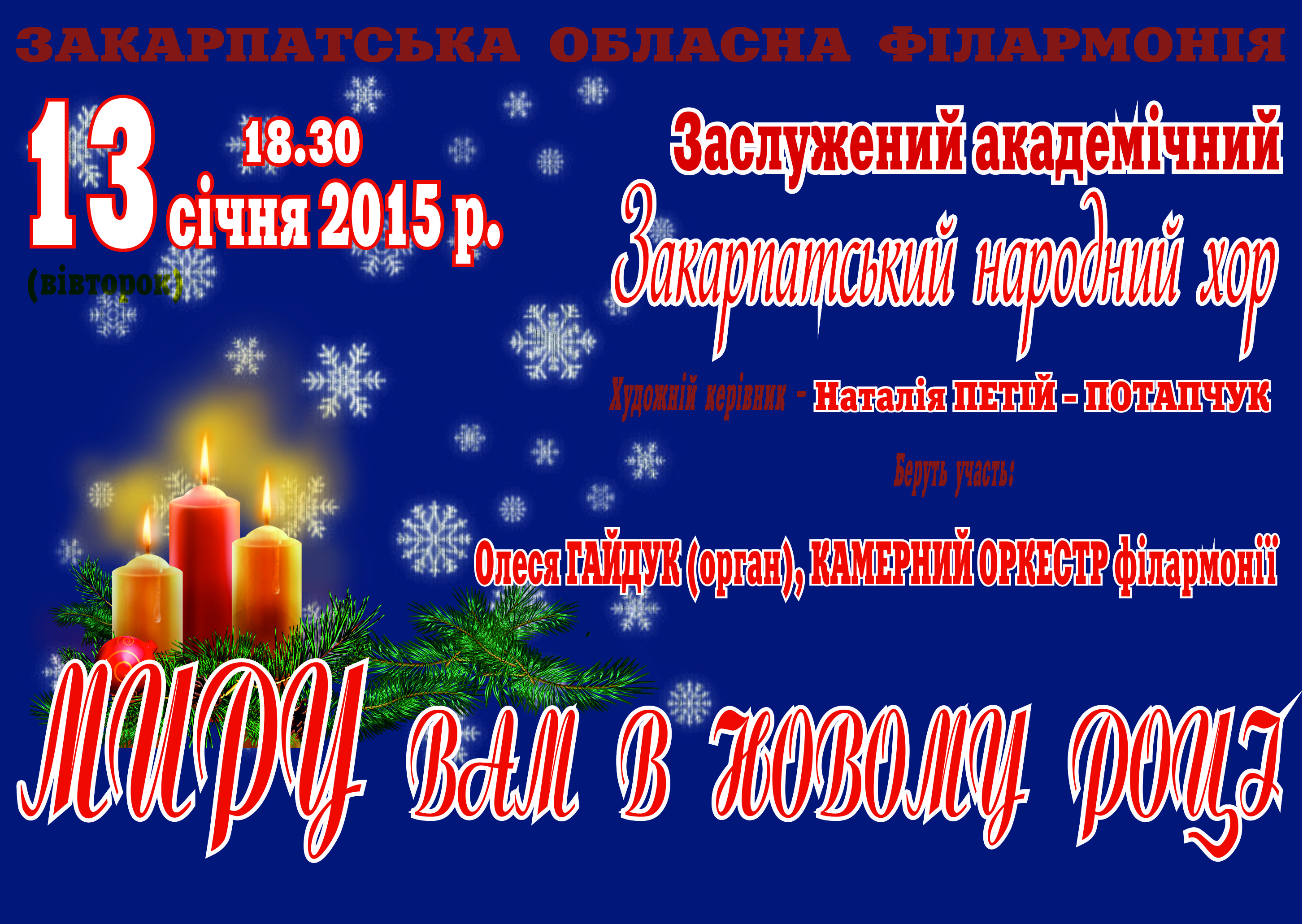 13 січня (вівторок) о 18.30 велика концертна зала Закарпатської філармонії запрошує на Концерт заслуженого академічного Закарпатського народного хору «МИРУ ВАМ В НОВОМУ РОЦІ!».