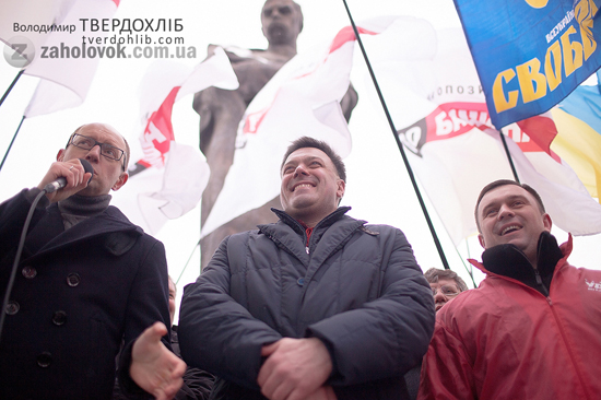 Ще у п’ятницю опозиція закарпатцям придумала повстання. І не просте, а всеукраїнське. Обіцяли, що приїде і сильний, і той, що в очках, і Тягнибок. Але Кличко не приїхав, оправдавшись, що зараз закордоном. Арсеній з Олегом привели на центральну площу Ужгорода купу людей – і студентів, і пенсіонерів, і середнячок. І вчителів, і школярів, і працівників штабів. Жителі Рахівщини через такий далекий путь до зустрічі в повстанській ході хотіли йти першими, але «Свобода» сказала, що «наш керівник сказав йти першими нам». Поки ті сварилися, на Театральні прийшов Тягнибок і став чекати Яценюка. Ужгородці злилися, що на мосту створили натовп і нервово вирішували «краще йти пити каву в «Меделін». 15-річні діти стидливо тримали замерзлими руками плакати «Юлі – волю!», «За свободу!» і «За достойну пенсію!». Лідери опозиції радо здоровкалися з дідусями, махали руками дівчатам і охоче давали журналістам інтерв’ю. Коли ж прийшли на площу Народну, то всі троє – і Яценюк, і Тягнибок, і Пацкан-Кличко зраділи, що там нема Балоги. Поговорили трохи (нє, не трохи!) і розійшлися. «Кажуть, повстання в Ужгороді! Нє, не чув», – кажуть ті, хто не журналіст і не мітингувальник.