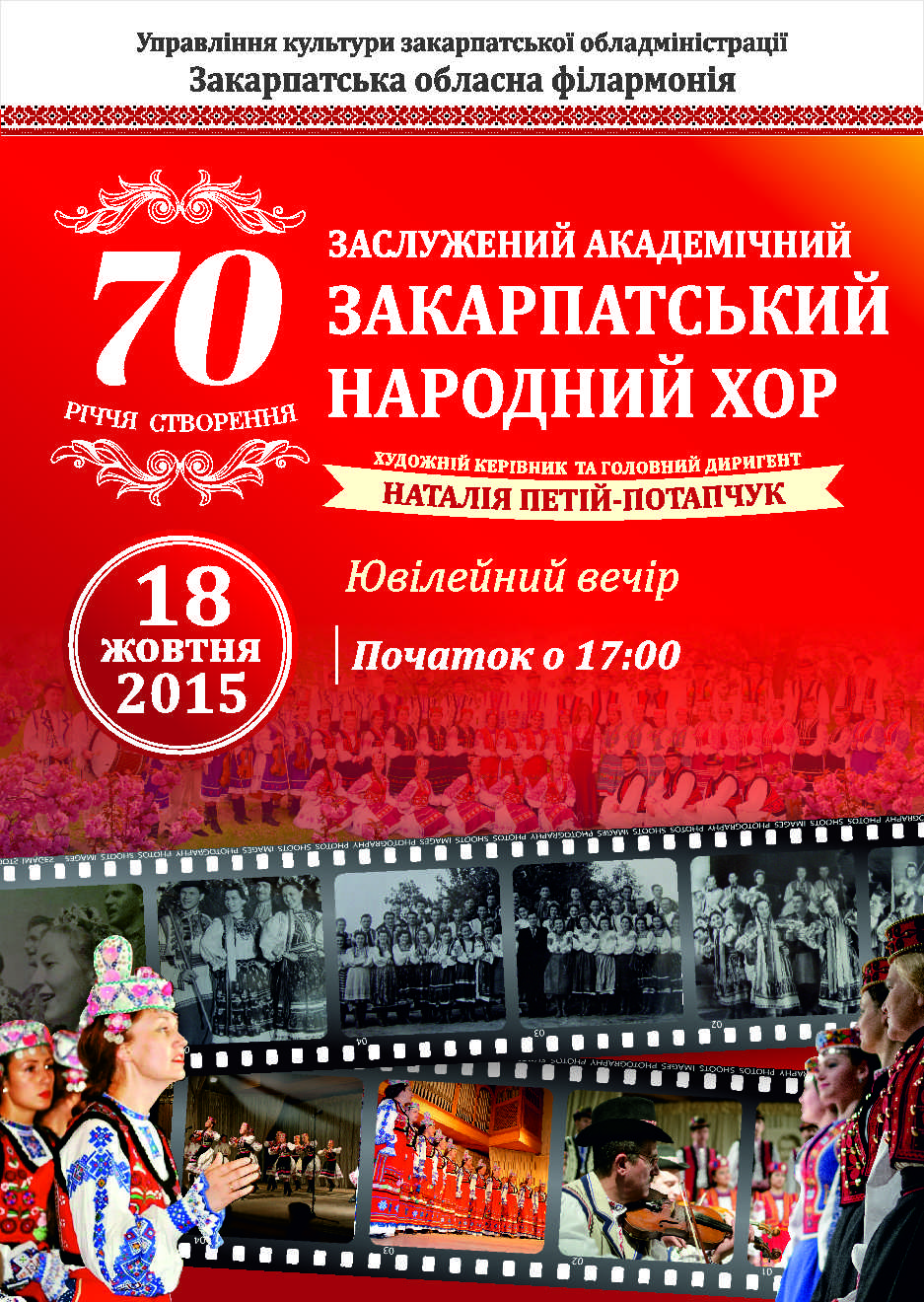 Кульмінацією ювілейного року Заслуженого академічного Закарпатського народного хору стане святковий вечір, який відбудеться 18 жовтня о 17.00 у Закарпатській обласній філармонії. Художній керівник колективу, заслужений працівник культури України Наталія ПЕТІЙ-ПОТАПЧУК. Ведучі – Наталія ДЕЛЕГАН та Василь МАТОЛА. У програмі – твори із «золотого» фонду, а також нові композиції і постановки. До привітань долучаться перші особи краю, гості із Києва, Угорщини, Словаччини та інших країн.