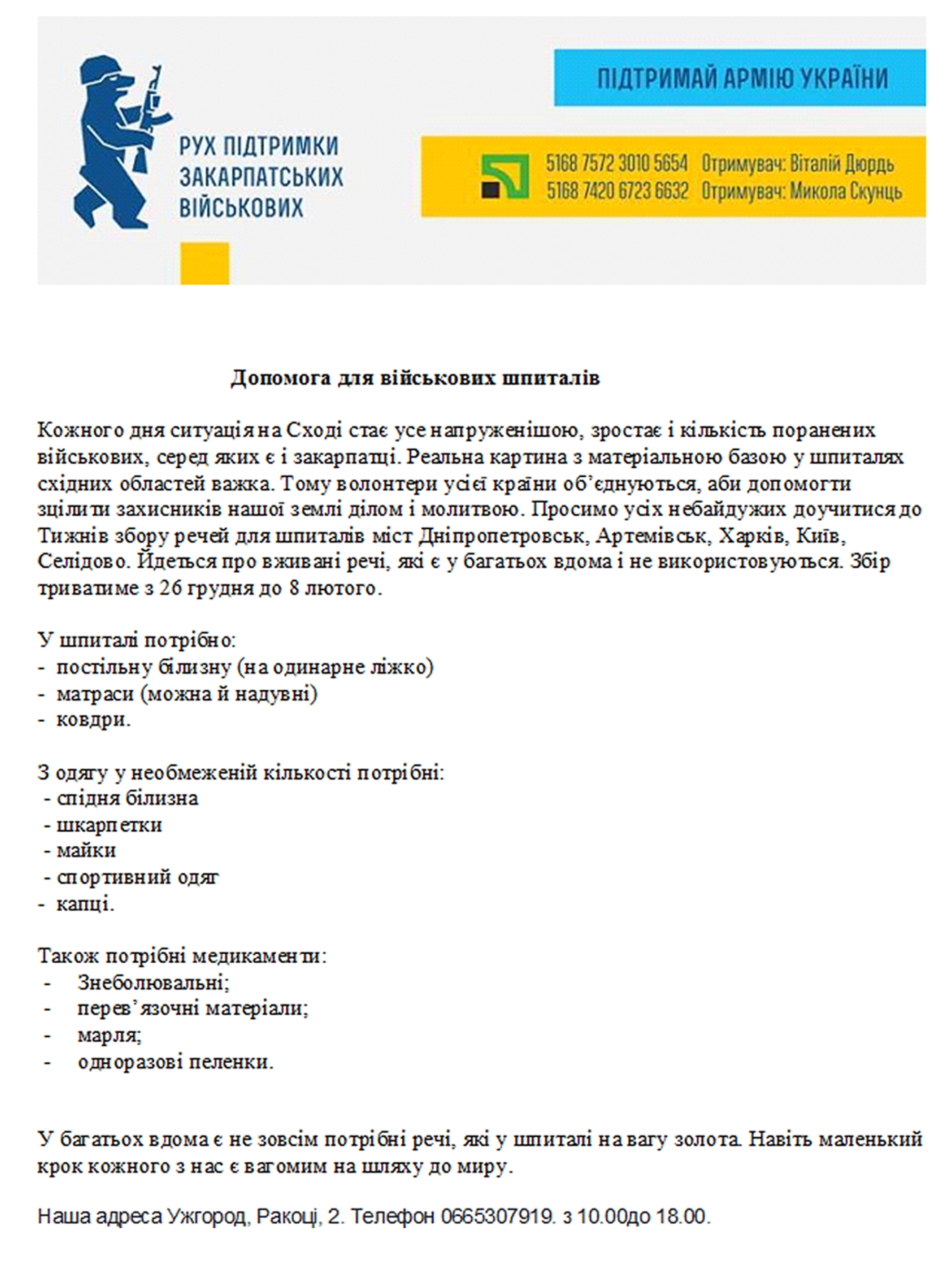 Кожного дня ситуація на Сході стає усе напруженішою, зростає і кількість поранених військових, серед яких є і закарпатці. Реальна картина з матеріальною базою у шпиталях східних областей важка. Тому волонтери усієї країни об’єднуються, аби допомогти зцілити захисників нашої землі ділом і молитвою. Просимо усіх небайдужих долучитися до Тижнів збору речей для шпиталів міст Дніпропетровськ, Артемівськ, Харків, Київ, Селідово. Йдеться про вживані речі, які є у багатьох вдома і не використовуються. Збір триватиме з 26 грудня до 8 лютого.