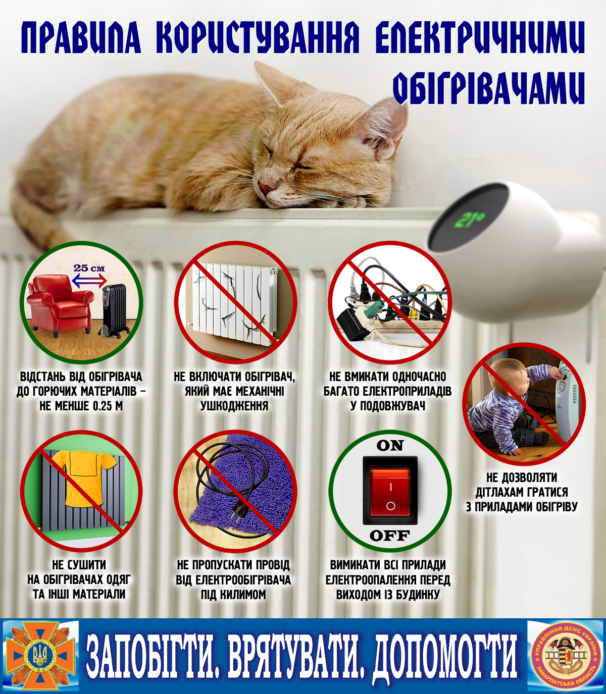 Якщо ж Ви віддаєте перевагу електричним опалювальним пристроям, обирайте тільки сертифіковані прилади. Зважайте на те, що електрообігрівач не можна ставити біля завісок або меблів – відстань від нього до горючих матеріалів має становити не менше 0.25 м. Задля власної безпеки не встановлюйте нагрівальні прилади на підставки з легкозаймистих предметів, не розташовуйте їх безпосередньо під розеткою, а також на шляхах евакуації людей, не застосовуйте пристрої з механічними ушкодженнями, не вмикайте одночасно багато електроприладів у подовжувач, не допускайте дітей до нагрівальних приладів, не накривайте електрообігрівач і не залишайте його ввімкненим під час виходу з будинку.