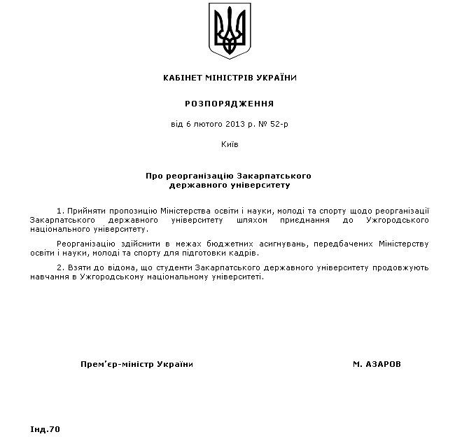 Розпорядженням Кабміну№ 52-р від 6 лютого 2013 року Закарпатський державний університет приєднали до Ужгородського національного університету. Відповідний документ оприлюднено на урядовому порталі.