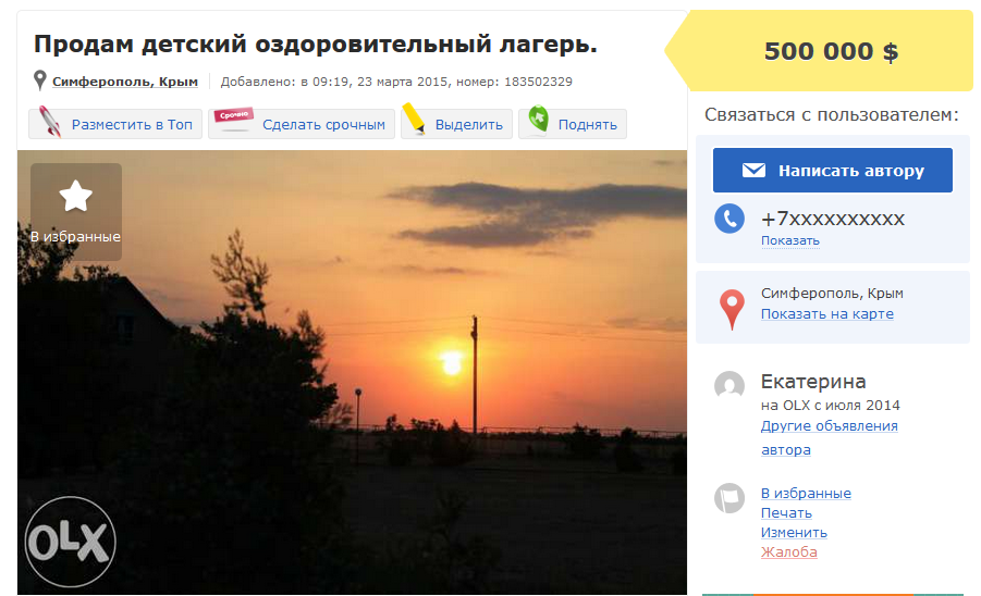 У Криму біля берегу затоки Чорного моря продається дитячий табір площею 2,7 га вартістю $500 тис. На території знаходяться футбольне поле, баскетбольний і волейбольний майданчики, настільний теніс, а також своя обладнана пляжна хона. Діти проживають у 2-поверхових будиночках. Групи формуються по 30 осіб, - пише Оксана Венгровська, PR-менеджер OLX.ua.