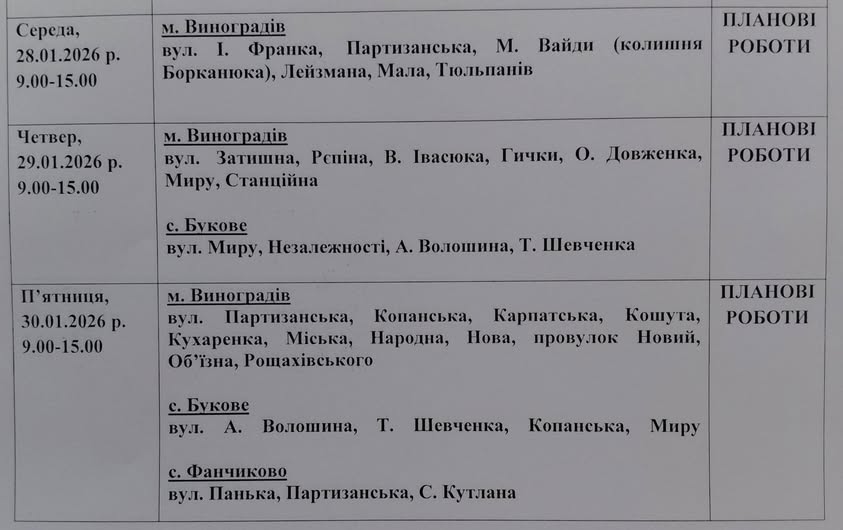 вт, 27/01/2026 - 17:05 Виноградівська міська рада повідомляє, що за інформацією ПрАТ «Закарпаттяобленерго», у громаді не буде світла.Електропостачання буде відсутнє у зв’язку з плановими роботами. Автор: Gabriella Rudenko Новини інших ЗМІ Коментувати Ваше ім'я Електронна пошта Вміст цього поля є приватним і не буде доступний широкому загалу. Коментар Про текстові формати Comment Дозволені теґи HTML: <em> <strong> <cite> <code> <ul type> <ol start type> <li> <dl> <dt> <dd> Рядки й абзаци переносяться автоматично. Адреси вебсторінок та адреси електронної пошти автоматично перетворюються у посилання. CAPTCHA Мета цього запитання — довести, що ви є реальним відвідувачем і запобігти автоматизованим розсиланням спаму. Зберегти Залиште це поле порожнім