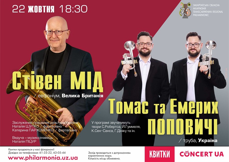 22 жовтня о 18:30 вас запрошують Стівен МІД - британський музикант-віртуоз, майстер гри на евфоніумі та знані у нашому краї та за його межами брати-близнюки Томас та Емерих Поповичі.
